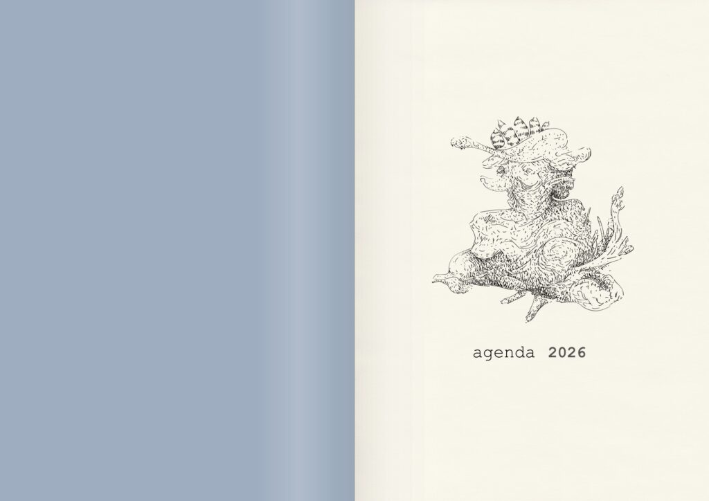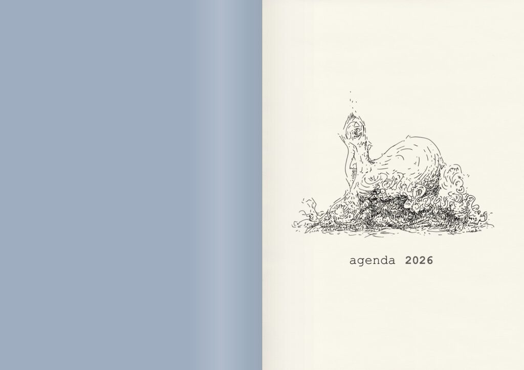 Estoy muy contenta de anunciar que La vida en las nubes (un cuadro hecho en acrílico sobre lienzo de 50 x 150 cm) da forma a la nueva agenda 2026, diseñada y confeccionada por las manos expertas de Analía Blanco. Las imágenes interiores (una en la portada y otra en el colofón) son tintas hechas especialmente para la ocasión, y recrean algunos de los dibujos del original.