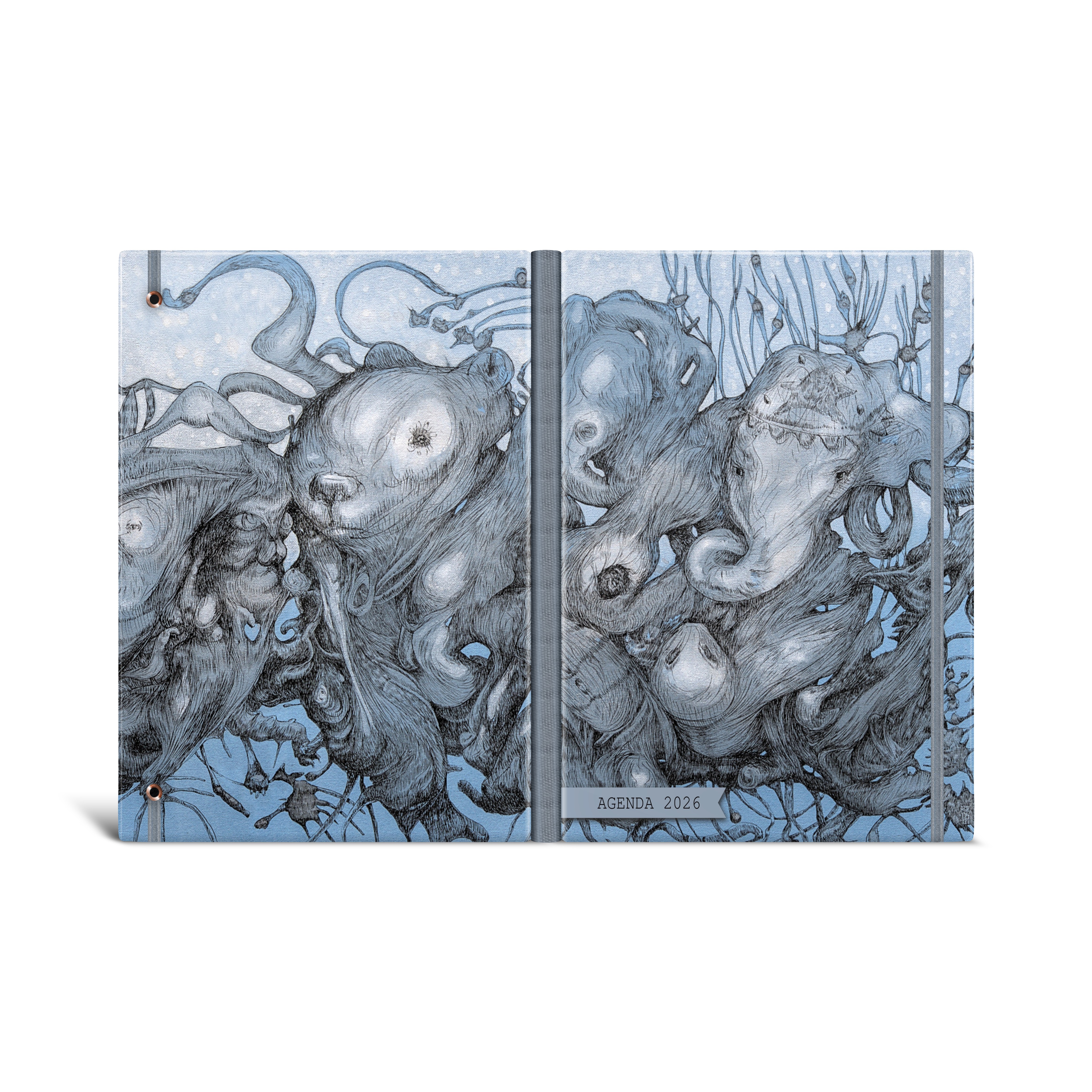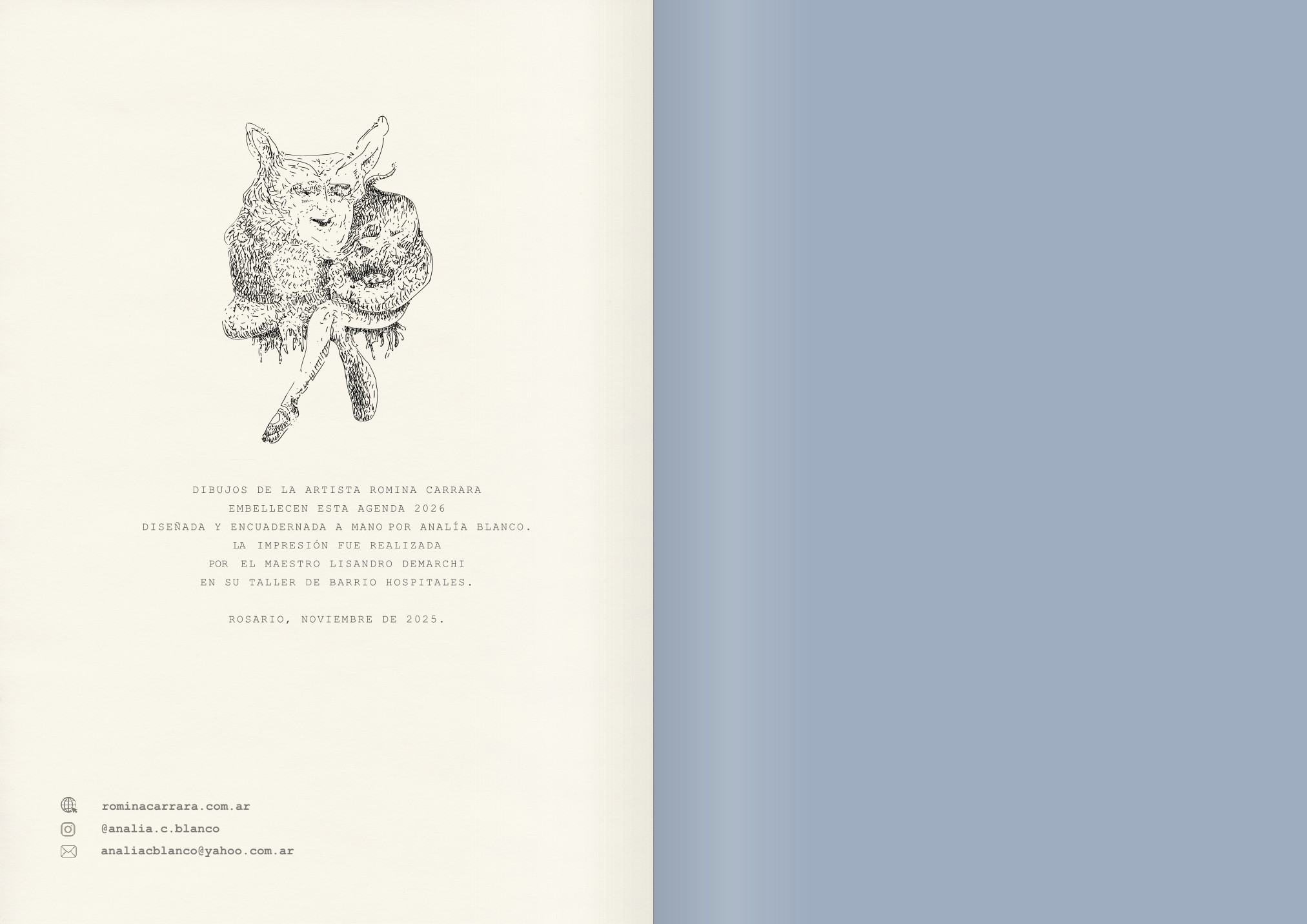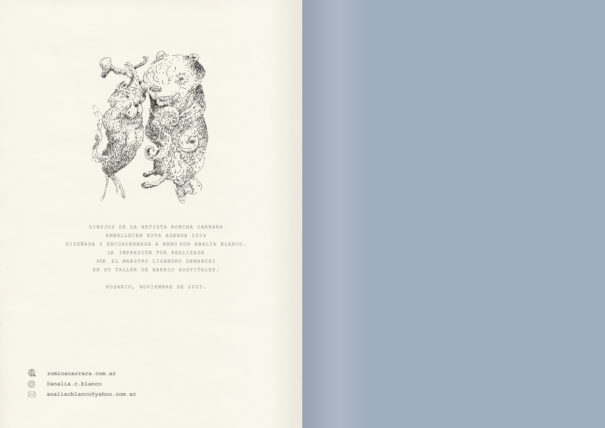 Estoy muy contenta de anunciar que La vida en las nubes (un cuadro hecho en acrílico sobre lienzo de 50 x 150 cm) da forma a la nueva agenda 2026, diseñada y confeccionada por las manos expertas de Analía Blanco. Las imágenes interiores (una en la portada y otra en el colofón) son tintas hechas especialmente para la ocasión, y recrean algunos de los dibujos del original.