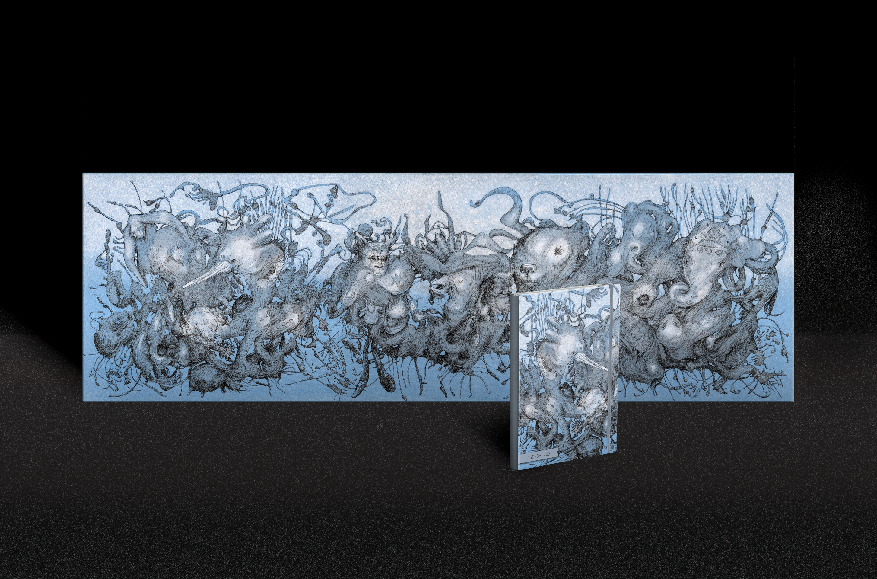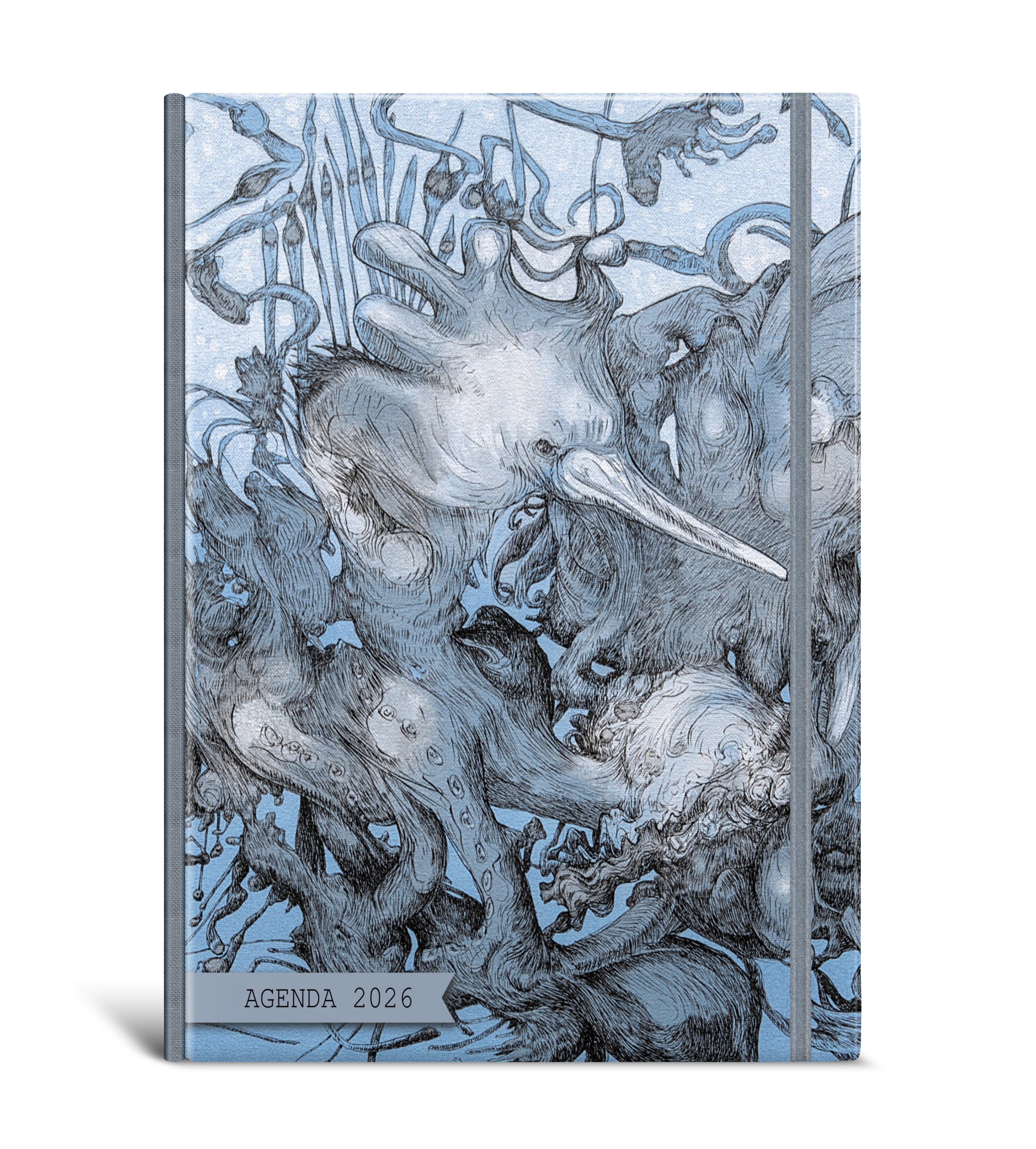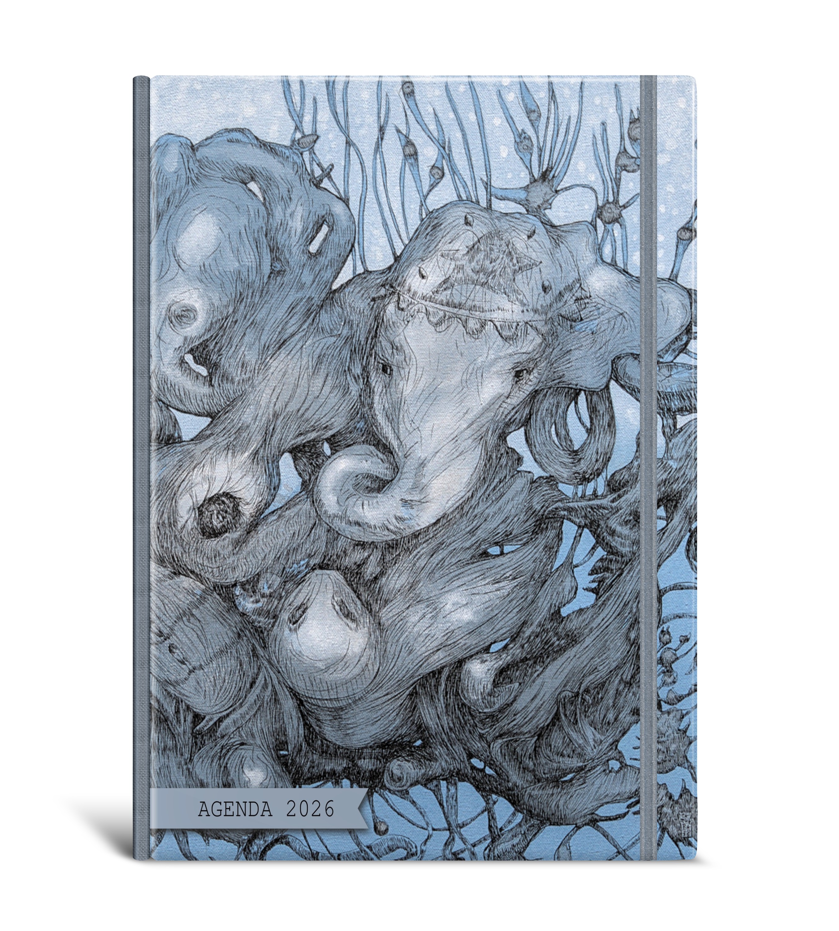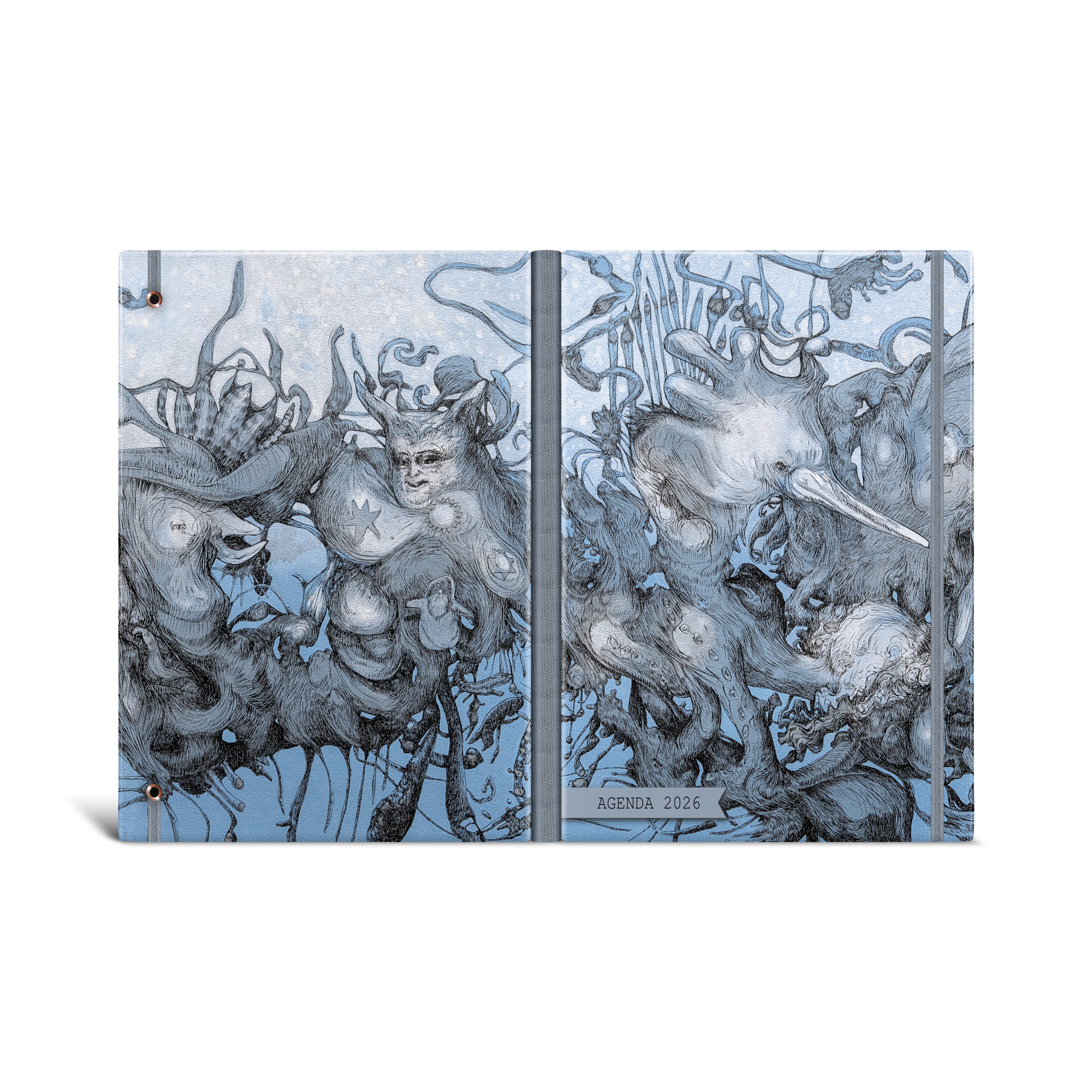 Estoy muy contenta de anunciar que La vida en las nubes (un cuadro hecho en acrílico sobre lienzo de 50 x 150 cm) da forma a la nueva agenda 2026, diseñada y confeccionada por las manos expertas de Analía Blanco. Las imágenes interiores (una en la portada y otra en el colofón) son tintas hechas especialmente para la ocasión, y recrean algunos de los dibujos del original.